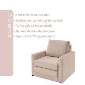 Assentos com espuma flexível de poliuretano densidade 26kg/m, certificada, fabricação própria. Com assento dobráveis, ela abre totalmente virando uma cama. Enchimento do encosto: espuma D-26 e fibra de poliéster siliconada. Estrutura de madeira maciça de pinus e eucalipto 100% reflorestada. Fixação da estrutura: grampos galvanizados anti-ferrugem. Apoiados no chão com sapatas de pvc. Revestimento/tecido: veludo 100% poliéster, com toque macio.