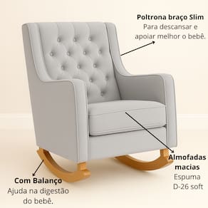 O estofamento em Tecido Saturno proporciona uma suavidade incomparável, enquanto as almofadas com espuma D-26 oferecem um suporte ergonômico que alivia a pressão na coluna. Essa poltrona é ideal para amamentação, com um formato que assegura o bem-estar tanto da mãe quanto do bebê.
