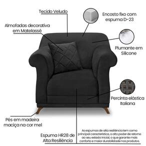A poltrona Arras tem um toque retro clássico, sua principal característica a versatilidade. Ele se encaixa em qualquer estilo de decoração: na sua casa ou no seu escritório, esse modelo garante beleza e conforto. Feito em madeira de reflorestamento e com suas espumas de alta resiliência tem como principal característica, o alto poder de retorno ao seu estado inicial, o que garante mais conforto e maior durabilidade nos produtos Acompanha Almofadas extras: 01 Acompanha Puff: Não Almofada do assento: Fixa Almofada do encosto: Fixa Altura do assento até o chão: 45 Altura do Encosto: 45 Altura dos Pés: 12 Ambiente Principal: Sala de Estar Complexidade da Montagem: Baixa: pode ser montado por uma pessoa sozinha Cor: Preto Cor do Produto: Preto Design Assinado: Não Enchimento do Assento: Espuma D-28 Enchimento do Braço: Espuma D-26 Enchimento do Encosto: Espuma D-26 Encosto para a Cabeça: Não Estampado: Não Extensível: Não Firmeza do Assento: Macio Informações Complementares: A poltrona Arras tem um toque retro clássico, sua principal característica a versatilidade. Ele se encaixa em qualquer estilo de decoração: na sua casa ou no seu escritório, esse modelo garante beleza e conforto. Feito em madeira de reflorestamento e com Itens Inclusos: 1 Poltrona Linha ou Coleção: Arras Manual de Montagem e Instalação: https://cdn2.madeiramadeira.com.br/atributo/spezzia-decor/1254112-manual-arras-pdf.pdf Material do Braço: estofado Material dos Pés: Madeira Maciça Modelo de Poltrona: Fixo Necessita Montagem: Sim Origem do Produto: Nacional Peso: 27.5 Possui Percintas Elásticas: Sim Possui Pés: 04 Possui Rodízio: Não Recomendações de Uso, Manutenção e Limpeza: Limpeza: Utilize pano levemente úmido Sistema de Montagem: É necessário apenas fixar os pés. Suporta Até (kg): 150 Tecido Predominante: Veludo Tipo de Assento: Fixo Tipo de Encosto: Fixo Tipo de Espuma do Assento: Espuma HR Tipo de Poltrona: Decorativa