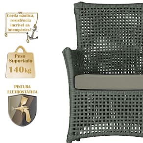 A corda náutica adiciona um toque de rusticidade moderna, enquanto o estofado impermeável garante que sua poltrona esteja sempre impecável, mesmo após uma chuva inesperada ou um acidente com líquidos.