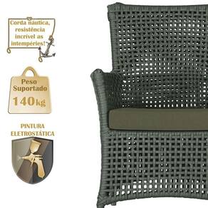 A corda nautica adiciona um toque de rusticidade moderna, enquanto o estofado impermeavel garante que sua poltrona esteja sempre impecavel, mesmo apos uma chuva inesperada ou um acidente com liquidos.