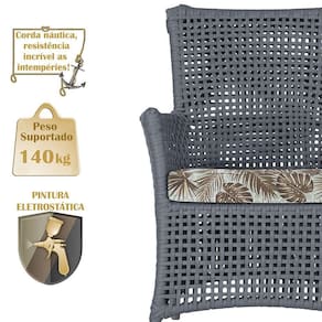 A corda nautica adiciona um toque de rusticidade moderna, enquanto o estofado impermeavel garante que sua poltrona esteja sempre impecavel, mesmo apos uma chuva inesperada ou um acidente com liquidos.