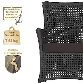 A corda nautica adiciona um toque de rusticidade moderna, enquanto o estofado impermeavel garante que sua poltrona esteja sempre impecavel, mesmo apos uma chuva inesperada ou um acidente com liquidos.