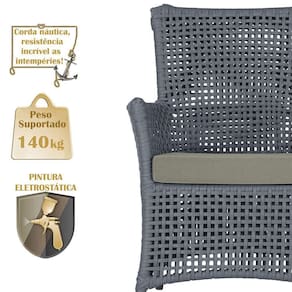 A corda nautica adiciona um toque de rusticidade moderna, enquanto o estofado impermeavel garante que sua poltrona esteja sempre impecavel, mesmo apos uma chuva inesperada ou um acidente com liquidos.