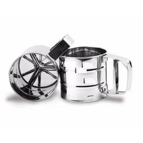 Polvilhador em Inox Use este Polvilhador para polvilhar e peneirar farinha ou açúcar sobre doces, salgados, massas e superfícies. Prático e higiênico, ele dispensa o uso de qualquer outro utensílio para realizar esta tarefa, já que é possível pegar os ingredientes diretamente sem sujar as mãos e possui um sistema de gatilho que ajuda a peneirar e polvilhar delicadamente com uma mão só. Conteúdo 1 Polvilhador Material Aço Inoxidável Medidas 15cm largura 10cm diâmetro 12,5cm altura