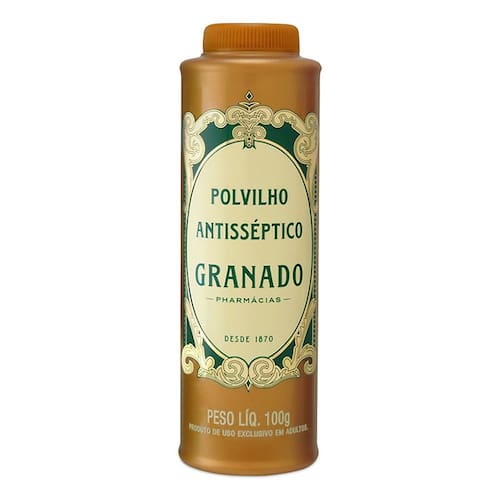 POLVILHO ANTISSÉPTICO GRANADO TRADICIONAL Produto de uso exclusivo em adultos. Combate assaduras, brotoejas e os odores da transpiração dos pés e axilas. Previnem pruridos e frieiras. Clinicamente tes