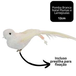 Pomba Branca Natal com Plumas e Lantejoulas 12cm com Presilha