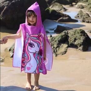 Saída de banho poncho infantil com capuz e saco de lavanderia. Estampas coloridas e alegres que veste a criança de cuidados e conforto. O roupão infantil deixa as crianças mais protegidas contra vento, sol e areia. Ideal para levar à praia ou piscina.