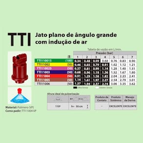 Além disso, a facilidade de alinhamento é assegurada quando utilizada em conjunto com a capa e o anel de vedação Quick TeeJet. Seja para agricultura, horticultura ou outras aplicações agrícolas, a Ponta de Pulverização Teejet TTI11003-VP Azul oferece desempenho excepcional e precisão na distribuição de produtos químicos, tornando-se uma escolha confiável para profissionais do setor.