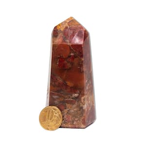 Esta peça única de Jaspe Monet é uma pedra natural mineral lapidada manualmente em formato de gerador sextavado com 6 faces e pico. Com cores vibrantes de marrom, rajas bege, cinza e toques de branco, ela é perfeita para colecionadores, práticas esotéricas ou para decorar ambientes, trazendo energia e sofisticação. Características:\nNome da Pedra: Jaspe Monet Cores: Vermelho / Amarelo queimado. O jaspe monet é uma pedra semipreciosa que pode ter cores terrosas, como marrom, verde, amarelo e vermelho. Corte: Gerador lapidado manual com 6 faces Claridade: Denso e brilhoso Medidas Aproximadas: 90 a 100 mm Peso Aproximado: 100 a 250 gramas Origem: Brasil (América do Sul)\nPor se tratar de um material natural, as pedras podem apresentar variações nas cores, veios e tonalidades. Estas características naturais não podem ser motivo de recusa do produto. As variações nas cores, veios e tonalidades são normais para a jaspe monet, pode receber uma variação que não se apresenta na foto(de acordo com estoque) Observação: Por ser uma pedra natural, pode apresentar variações nas tonalidades e grafismos, além de pequenas inclusões que podem se assemelhar a fissuras – um fenômeno natural em minerais autênticos. Recomendamos hidratação com óleo mineral para maior preservação. Ideal para quem busca uma peça única e cheia de energia para o seu espaço ou coleção. Marca: CristaisdeCurvelo