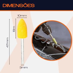 - Marca: Dremax - Referência: PM019 - Diâmetro da cabeça: 10mm - comprimento da cabeça: 18mm - Comprimento total: 47mm - Formato: Cônica - Diâmetro da haste: 3mm - Gramatura: Grão 240 - Material da ponta: Óxido de alumínio Amarelo Corundum Premium - As pontas montadas AMARELAS são indicadas para uso geral, com resultado mais fino que as tradicionais pontas rosas - Uso em micro retíficas de qualquer marca com pinça de 3mm - Indicada para desbaste e pré-acabamento em metais, joias, pedras preciosas, vidro, entre outros materiais - Muito utilizada por ourives, relojoeiros, hobbistas e dentistas para desbastar e retificar peças em geral - Seu formato facilita o trabalho em locais de difícil acesso - Garantia: 90 dias contra defeitos de fabricação