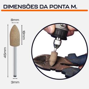 Ponta Montada 8mm Cônica de Couro Haste 3mm para Polimento com Micro Retíficas Dremax - Marca: Dremax - Referência: PM035 - Material: Couro de Vaca - Indicado para acabamento e polimento - Diâmetro da haste: 3mm - Diâmetro da ponta: 8mm - Altura da ponta: 18mm - Comprimento total: 45mm - Gramatura: Grão 180 - Formato: Cônica Ponta de Bala - As pontas montadas rosa são indicadas para uso geral - Uso em micro retíficas de qualquer marca com mandril de 3mm - Indicada para afiação, esmerilhamento e desbaste em metais, joias, pedras preciosas, vidro, entre outros materiais - Seu formato facilita o trabalho em locais de difícil acesso - Garantia: 90 dias contra defeitos de fabricação A DREMAX é a primeira e única marca brasileira dedicada exclusivamente às micro retíficas, acessórios e acoplamentos para esta indispensável ferramenta. Seja para trabalhos de precisão, artesanato, modelagem ou reparos, a DREMAX tem o produto certo para você - Ponta Montada Amarela: Alta dureza para polimento fino. Grão 240 - Ponta montada Azul: :Alta dureza para acabamento médio. Grão 150 - Ponta Montadas Rosa: Alta dureza e tenacidade acabamento grosso Grão. 120 - Ponta Montada Borracha Verde: Flexível, para retificação e polimento precisos. Grão 150 - Ponta Montada de Couro: Desempenho melhor do que a ponta de borracha verde, também ideal para polimento. Grão 180 - Ponta Montada Borracha com Abrasivos: Retificação mais nítida e rápida. Grão 120 - Ponta montada de Feltro: Polimento fino em metais e materiais não metálicos Marca: Dremax