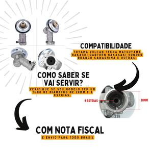 leia atentamente a descrio antes de comprar o produto - produto de alta qualidade e durabilidade. - produto da loja compativel com modelos citados. - aconselha-se um profissional para manuteno do seu equipamento. - imagens meramente ilustrativas. ========================== Item:ponteira completa de transmisso para roadeira Compatibilidade de modelos: 40 55 cilindradas Diametro do tubo: 28mm Estrias: 9 Compatibilidade de marcas: vulcan, toyama, branco garthen, nakashi, trapp shindaiwa, kawashima, yamasaki e outras marcas. + importante Verifique antes da compra se sua ponteira a ser substituida tambm 28mm de tubo e 9 estrias. ========================== A os produtos so novos R: todos os produtos da so novos com do seu fabricante. D como so realizadas as entregas R: todas as entregas utilizamos o martket place, sistema de logstica do prprio market place, envio mais rpido e seguro do brasil. Entregas em rea rural stios , fazendas , chcaras , estncias , quinta , granjas e outras exceto as que tenham cep prprios , logradouros de difcil acesso ou em reas de risco . Podem no serem realizadas ou chegar depois do prazo previsto. Nesses casos recomendvel ter um outro endereo de entrega no centro da cidade do cep informado. R: sim, desde que more perto de nossa loja fsica, localizada em so paulo capital. F os produtos possuem R: todos produtos possuem direto com o seu fabricante de no mnimo 3 meses de acordo com a lei. Esse prazo estar no anncio. G qual a marca desse produto R:este produto de uma pea vendida com a marca buybuy. A mesma no se enquadra e se configura a um produto de outra marca ou fabricante que no seja a buybuy H -aceitamos troca de dados de faturamento aps compra R: confira o seu endereo de entrega cadastrado, pois no aceitamos alteraes do mesmo aps a compra. Marca: Não Informado
