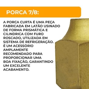 A porca curta 7/8 SAE para tubo de cobre é uma peça fabricada em latão usinado de forma prismática e cilíndrica com furo roscado. Utilizada em conexões do sistema de refrigeração em geral. Confere maior resistência mecânica e muito mais resistente a trincas proveniente dos esforços de torção em relação a similares usinadas. É um acessório amplamente recomendado para proporcionar uma boa fixação, garantindo um excelente acabamento.