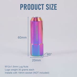 Substituição para Honda, substituição para Mitsubishi, substituição para Ford, substituição para Toyota, substituição para Hyundai, substituição para Kia, substituição para Acura, substituição para Lexus e outras marcas de carros. Descrição: - Condição: 100% novo - Materiais: Feito de alumínio leve de alta qualidade - Cor: igual à imagem Neo Chrome - Peso líquido das nozes: aproximadamente 30 g - Rosqueado para 12 x 1,5 mm - As hastes pesam 30 gramas cada. - Assento de estilo cônico de 60 graus. - 60 mm de comprimento e 20 mm de largura. - Instalação com soquete de 19 mm (não incluído). - O design fino elimina a necessidade de lugnuts de acionamento estriado. - Verifique o tamanho das porcas em suas rodas antes de comprar. - Instruções de instalação não incluídas, a instalação profissional é altamente recomendada. - Feito para caber em muitas rodas de reposição e rodas de liga leve. Substituição para a maioria das rodas afinadoras e algumas rodas de estoque com assentos de bolota, cônicos ou cônicos. Substituição para Honda, substituição para Mitsubishi, substituição para Ford, substituição para Toyota, substituição para Hyundai, substituição para Kia, substituição para Acura, substituição para Lexus e outras marcas de carros. - Feito de alumínio aeronáutico T6068 usinado CNC de alta qualidade. - Passo de teto M12 x 1,5 mm - 20 peças e comprimento de 60 mm - Design aberto, ótimo com suas rodas de reposição. - Verifique as especificações/tamanho da rosca do padrão do pino do seu veículo antes de comprar.