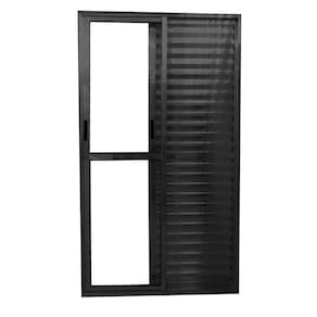 Esta porta balcão de correr com lado fixo direito possui 3 folhas sendo, 2 folhas com veneziana (1 de correr e 1 fixa) e 1 folha de vidro.