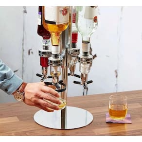 Dispenser Dosador e Suporte Giratório para 4 GarrafasRotating Bar Buttle for Drinks4 Suportes45ml por doseSuporta garrafas de até 1 litroSistema Giratório de servirFabricado em Alumínio, Aço Inox e ABSO Dispenser giratório para 4 garrafas é muito prático, sofisticado e moderno, perfeito para seu barzinho, adega ou até mesmo para presentear alguém especial. Além de usual, torna-se um item de decoração para seu bar, residencial ou comercial ou sua adega.Design moderno com base resistente, traz requinte e beleza para seu bar.Suporte com base giratória para 4 garrafas.Bicos anti -vazamento, evitam desperdícios.Quando acionado, o Dispenser derrama 45 mlHastes de alumínio com mola de alta pressão, conferem qualidade e durabilidade.Encaixe com molas para até 4 garrafas de bebidas de vários tamanhos até 1 litro.Material: Aço inox, alumínio e ABSMedidas do produto montado: (C x L x A)24 x 24 x 54cmPeso do produto: 1,5 kgDiâmetro da base: 24 cmQuantidade de torneiras: 4Sistema giratório Dose: 45 mlDimensões da caixa: (C x L x A)27 x 27 x 34cmPeso da embalagem: 1,7 kgObs.: Garrafas e copos não inclusos (meramente ilustrativos)