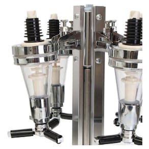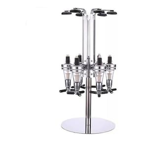 Material: Aço inox, alumínio e plástico Medidas do produto montado: 25x25x52cm Diâmetro da base: 25cm Quantidade de torneiras: 6 Sistema giratório com rolamento. Dose: 45ml Sistema de mola acomoda vários tamanhos de garrafa de 1 litro.B
