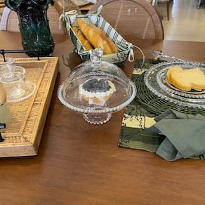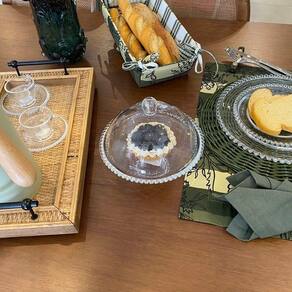 Prato com Pé e tampa de Cristal de Chumbo, que é um vidro com uma transparência incrível , com bordas decoradas em bolinhas, é uma peça linda para se usar como boleira ou com diversas sobremesas ou tortas . Essa peça pode ser composta com louças em outras cores, pois sua neutralidade orna em diversas composições.