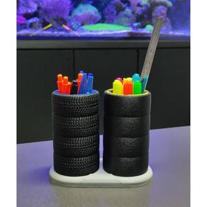 O Porta Caneta Pneu de Corrida é um organizador estiloso em forma de pilhas de pneus, perfeito para amantes do automobilismo. Produzido em impressão 3D, possui 12 cm de altura e 7 cm de diâmetro por pilha, com base inclusa.