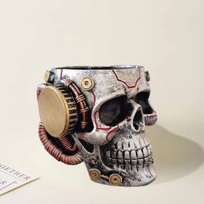 Material: resina Tamanho: 11,5* 13* 10 cm Peso: 270 g Design de caveira Cyberpunk: atraente porta-canetas em forma de caveira mecânica com engrenagens e fios detalhados, perfeito para mesas góticas, steampunk ou inspiradas no Halloween. Armazenamento multifuncional: funciona como porta-canetas, porta-lápis ou pote para canetas e também pode armazenar pincéis de maquiagem, réguas, tesouras ou pequenas ferramentas de escritório. Material de resina durável: feito de resina de alta qualidade, garantindo durabilidade, estabilidade e um impressionante acabamento metálico que se destaca em qualquer mesa. Organizador de mesa: mantém as canetas e os acessórios organizados, além de servir como um toque decorativo arrojado para escritórios, estudos ou espaços criativos pessoais. Decoração versátil: ideal para temas de Halloween, interiores góticos ou coleções de estilo steampunk, combinando utilidade com apelo artístico.