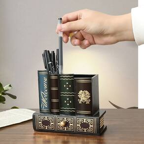 Material: MDF Tamanho: 15* 6,5* 13,5 cm Peso: 2.000 g Design de livro vintage: porta-canetas exclusivo com estilo de livros clássicos empilhados com padrões dourados detalhados, adicionando um charme retrô elegante a qualquer mesa ou sala de estudo. Armazenamento multifuncional: funciona como porta-canetas, porta-lápis ou pote de canetas, com compartimentos para canetas, réguas, tesouras e pequenos acessórios. Gaveta adicional: possui uma gaveta embutida na base para armazenar clipes, borrachas ou outros itens essenciais de escritório, combinando praticidade com design criativo. Material de madeira durável: feito de madeira MDF resistente, garantindo durabilidade duradoura e uma estrutura sólida para o uso diário. Organizador de mesa: mantém o papel de carta bem organizado enquanto serve como um organizador de mesa decorativo, perfeito para interiores em estilo de escritório, casa ou biblioteca.