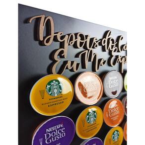 Marca de Cápsula: Dolce Gusto Marca: Facris Material: MDF Quantidade: 30 cápsulas Altura: 42cm Largura: 30cm Profundidade: 3cm Peso: 900gr.
