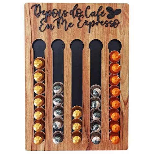 Uma peça com design moderno feita em MDF bi-laminado da Altíssima Qualidade e acabamento impecável. As frases confeccionadas neste porta cápsulas são feitas em alto relevo com corte a laser, que faz com que a peça tenha um requinte especial e diferenciado no mercado. Compre já o seu