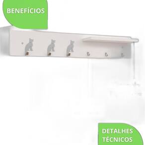 ESPECIFICAÇÕES TÉCNICAS Material: Madeira Material dos Ganchos de Cachorro: Aço 1020 Material dos Ganchos Menores: Metal Zamac Cor da Base: Branco Cor da Prateleira: Branco Cor/acabamento dos Ganchos: Cromado