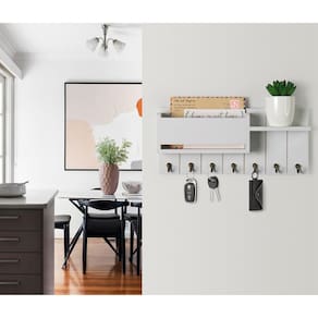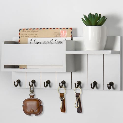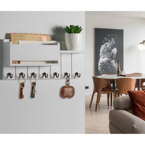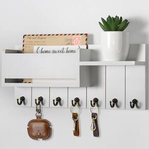 KEEP TRACK OF KEYS and other items attractively with the Key Holder for wall with shelf. This entryway shelf with hooks corrals keyrings, wallets, dog leashes and coats in 1 central location. - Não está mais procurando chaves: não consegue encontrar suas chaves quando está com pressa de sair? Não se preocupe, um porta-chaves ajudará você RelaxScene organizar chaves e outros pequenos itens, mantendo-os sempre à sua vista e ao seu alcance. - Área funcional exclusiva: projetamos três áreas funcionais para atender às suas necessidades de armazenamento. Existem 6 ganchos para chaves na prateleira, podem guardar suas chaves, bolsas, bonés, carteiras e assim por diante. O classificador de correspondência tem 8,5 cm x 21,5 cm, serve na maioria dos envelopes e cartões postais padrão dos EUA, o quadro de exibição certo pode colocar plantas pequenas e qualquer coisa que você goste. - Decoração moderna do quarto: o organizador de correspondências e chaves RelaxScene tem um visual moderno e ganchos rústicos. Você pode pendurá-lo na entrada, sala de estar, cozinha, quarto e escritório, é perfeito como decoração de parede. - Leve e resistente: a prateleira do porta-chaves é feita de madeira maciça de alta qualidade, tem as vantagens de leveza e robustez. Usamos ganchos mais grossos que são resistentes o suficiente para segurar casacos e objetos mais pesados. - Fácil de instalar: o pacote vem com bolsa de ferramentas e livro de instruções. Você pode instalar facilmente a prateleira de chaves em 10 minutos sem deixar furos desnecessários na parede. É especialmente adequado para apartamentos. Além disso, se você não estiver completamente satisfeito com a compra, não hesite em entrar em contato conosco. Oferecemos serviço pós-venda de 7 x 24 horas.