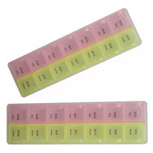 Porta Comprimido Semanal Manhã / Tarde Retangular Com 14 Compartimentos 21,5x6cm Porta medicamentos 2 compartimentos diários Divisão para cada dia da Semana Compartimentos diários para 7 dias da semana com 14 nichos Capacidade total: 1 Semana