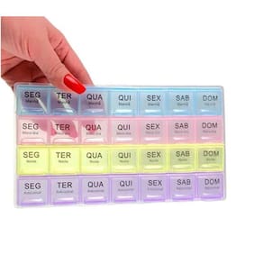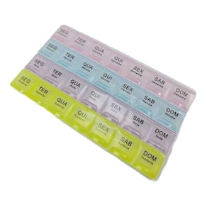 Você nunca mais vai esquecer de tomar seus remédios. Indispensável para quem faz uso contínuo e diário de medicamentos. Este porta medicamentos, vai facilitar sua vida e deixar tudo muito mais prático e organizado. Porta medicamentos com 4 compartimentos diários: Manhã, Tarde, Noite e Adicional. Compartimentos para os 7 dias da semana. Tamanho: 21 x 12 x 2 cm Nichos: 28 de 3 x 3cm cada Peso: 100g
