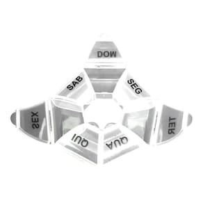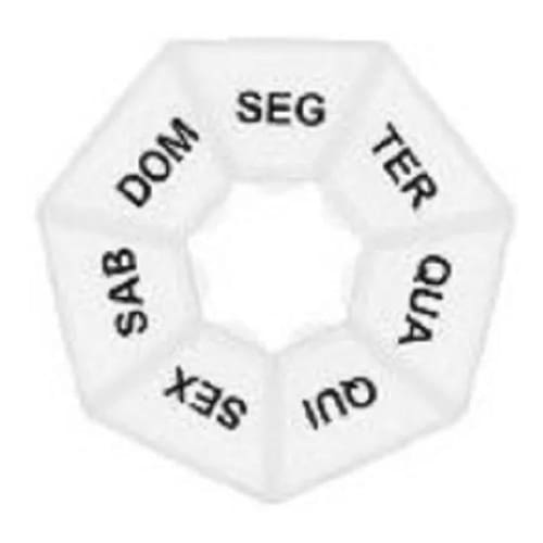 Porta comprimidos no formato heptagonal com 7 divisões independentes. Recomendação de Uso: Prático e funcional, protege sua medicação e evita o esquecimento, se já tomou ou não, pois cada compartimento é marcado com um dia da semana. Você pode guardar mais de um comprimido ou cápsula no mesmo compartimento. Especificação: Comprimento 8,5 cm, largura 8,5 cm, altura 2 cm. Material: plástico. Cor: transparente. Peso 20 g. Garantia de fábrica. Ean: 7908212156054