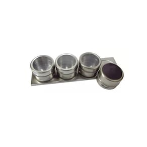 Conteúdo da embalagem: 04 potes em aço inox e base magnética. 01 base em aço inox. 02 saídas para o tempero. Imã na base dos potes.