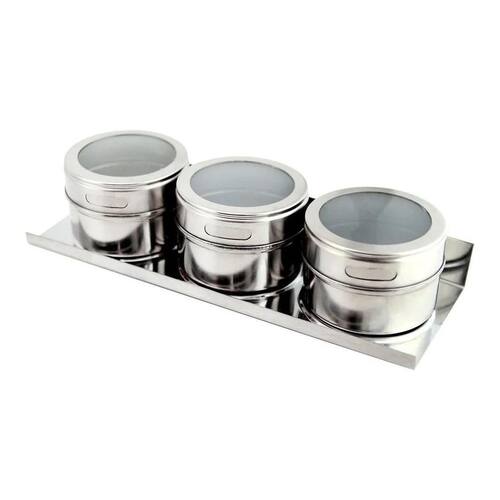 Porta Condimento Magnético 4 Peças Podem ser fixados em geladeiras, freezers, fornos e microondas Aço inoxidável escovado, imã e suporte metálico Não deixa cheiro nem gosto Visor de acrílico Cavidades diferenciadas para permitir a saída do tempero Completamente desmontável para limpeza Vedação completa sem vazamentos Lavável na lava louças Características Dimensões: 21x7,5cm / Frascos: 4,5x6,5cm Material: Aço inox Cor: Metálico Itens inclusos 01 Suporte 03 Frascos