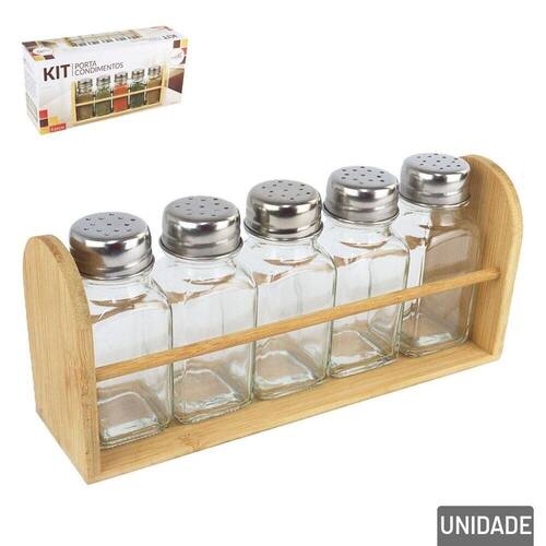 Porta Condimento Vidro 06 Pçs Suporte de Bam Mantenha seus condimentos organizados e ao alcance das mãos com o Porta Condimento de Vidro com 06 Peças e Suporte de Bambu. Este conjunto prático e elegante é perfeito para temperos, especiarias, ervas e outros condimentos essenciais. Com 5 frascos de vidro de 80ml cada, você pode armazenar diferentes tipos de temperos, mantendo-os frescos e visíveis. O Suporte de Bambu proporciona um design moderno e natural, garantindo estabilidade e organização no balcão ou na bancada da cozinha. Ideal para quem busca funcionalidade e um toque de charme rústico na decoração da sua cozinha.\nEspecificações:\nMarca : IMPORIENTE\nTipo de material : Aço Inox, Bambu, Vidro\nCores ou Estampa : Marrom, Prata, Transparente\nDimensões do Produto : 11 X 24 X 7 CM\nDimensões da Embalagem : 11 X 24 X 7 CM\nPeso Bruto (Gramas) : 0.601