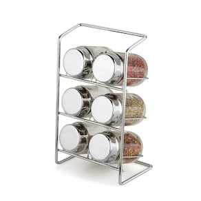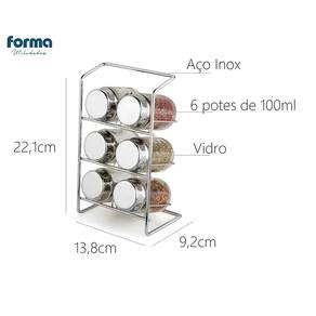 - 6 vidros com tampa 100 ml - corpo em vidro e tampa em aço cromado - 1 suporte em aço inox - Material: Aço Inox/Aço Cromado/Vidro - Dimensões: 13,8 x 9,2 x 22,1 cm