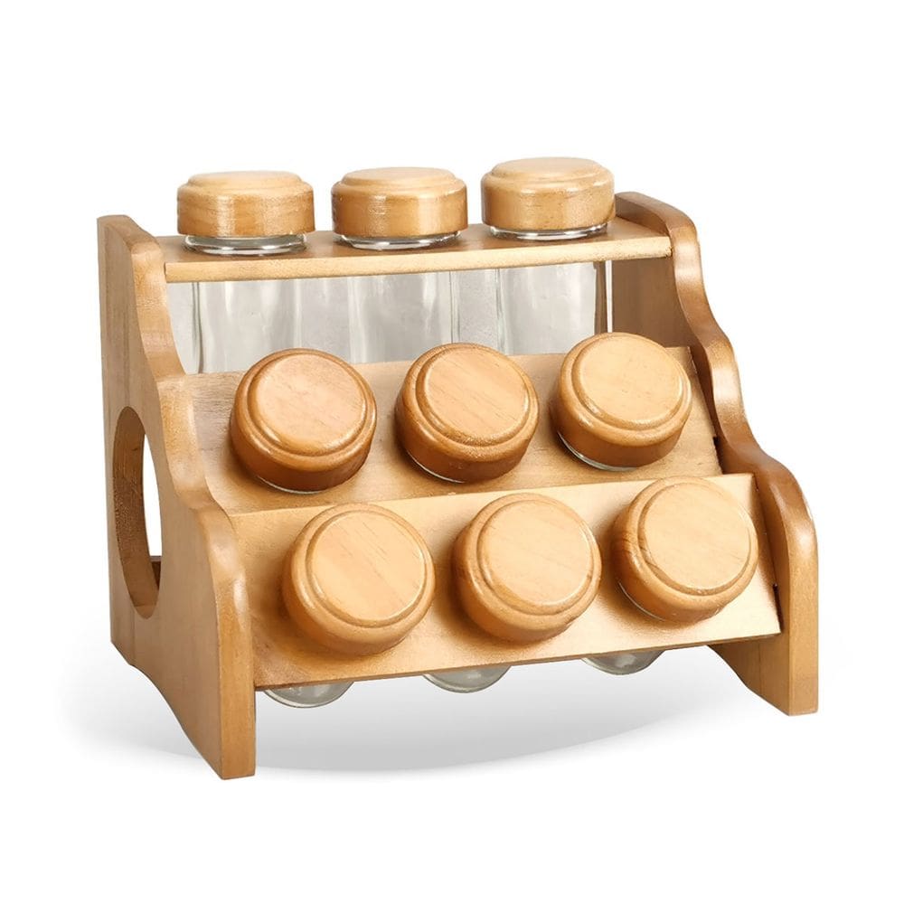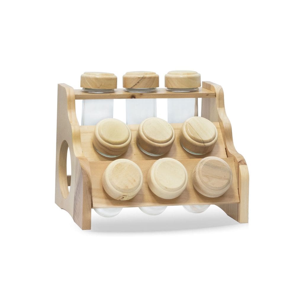 porta condimentos de madeira e vidro