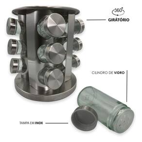 CONTÉM: 01 PORTA CONDIMENTO COM 12 PEÇAS GIRATÓRIO EM AÇO INOX E VIDRO
