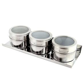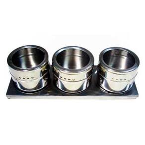 Dimensões: Suporte Retangular:20,7cm x 7cm x 2,7cm Potes: 4,5cm x 6,5cm Material: Aço inox Itens inclusos 01 Suporte Retangular 03 Potes Magnéticos Marca: Não Informado