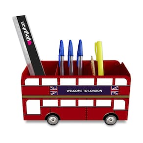 Tenha em sua sala,quarto ou escritório o Porta Controle Remoto ou Porta Lápis Ônibus Londres. Além de organizar, ele decora e deixa seu espaço no maior clima londrino. Código de Barras: 7894935097111 Dimensões da Peça: 19 x 7 x 11 cm Composição: Chapa de aço com pintura epóxi-pó branca e vermelha com impressão colorida. Ean: 7894935097111