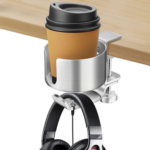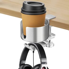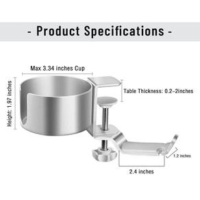 * Porta-copos multifuncional 2 em 1: design inovador - Design universal para porta-copos e porta-fones de ouvido. Porta-copos de mesa e porta-fones de ouvido feitos de liga de alumínio de alta qualidade, resistente a rasgos, podem suportar várias temperaturas, perfeito para bebidas quentes ou frias, telefones ceres, pequenos vasos de flores * Suporte de fone de ouvido robusto e ajustável: - Capacidade de carga: 5 kg (11 libras). - Design com parafuso ajustável, o suporte de fone de ouvido com braço giratório de 360° oferece uma opção de armazenamento versátil para pendurar fones de ouvido, bolsas, guarda-chuvas, roupas, chapéus, etc. Seco e durável. * Fácil de instalar, estrutura DIY* Uso direto, sem necessidade de instalação. O porta-copos é fácil de instalar e se encaixa em espessuras de mesa de 0,31" a 1,96". O porta-copos pode ser sozinho como suporte de fone de ouvido (com ferramenta de remoção e vídeo). * Livre de arranhões: o suporte de silicone para fone de ouvido e as almofadas de silicone não arranham a superfície. Melhor proteção para fones de ouvido e mesas. O porta-copos e o porta-fones de ouvido são feitos de alumínio de alta qualidade, que é resistente e durável. * Sem derramar: o porta-copos para mesa pode guardar sua bebida na lateral da mesa. CHEGA de derramar bebidas na mesa. Mantenha sua mesa limpa e organizada. ***Certifique-se de que o diâmetro do copo esteja dentro de 3,34 polegadas***