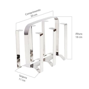 Porta Copos em Aço Inox Para 6 Copos Escorredor e Porta Copos em Inox. Robusto, compacto e de design moderno. Capacidade para 6 copos, ele é feito em aço inox: mais resistente a corrosão. Disponha seus copos secarem de forma prática, higiênica e organizada Altura: 18cm;Largura: 11cm;Comprimento: 20cm;Peso Aprox. 0,350 kg.