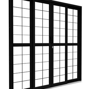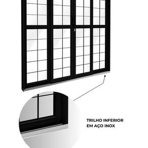 Com design equilibrado e visual contemporâneo, esta porta de correr central alia segurança, funcionalidade e luminosidade. Composta por quatro folhas, sendo duas móveis e duas fixas, oferece abertura central que amplia a passagem e integra ambientes com elegância.
