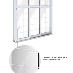 Possui duas folhas móveis e uma fixa, com grade quadrada que valoriza o visual do ambiente sem abrir mão da proteção. O vidro liso de 4cm permite ampla entrada de luz natural, garantindo leveza e conforto visual.