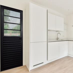 A Porta é produzida em Alumínio, possui acabamento com Pintura Eletrostática na cor Preta, são indicadas para utilização em diversos ambientes, como Salas, cozinhas, áreas de serviço.