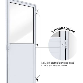 O produto chega completo, pronto para instalação, atende à norma ABNT NBR 10.821, passa por rigorosos testes de qualidade e oferece 6 anos de garantia. Vidro: Liso Incolor Ambientes Recomendados: Externo, Interno Acompanha Batente: Sim Acompanha Dobradiça: 03 Acompanha Fechadura: Sim Acompanha Guarnição: Não Acompanha Manual de Instalação: Sim Acompanha Trinco: Sim Altura: 215 cm Ambiente Principal: Cozinha codigo_ean: 7898575479153 Cor: Branco Cor do Batente: Branco Cor do Produto: Branco Cor do Produto: Branco Cor do Vidro: Incolor Cor Predominante: Branco Desenho do Vidro: Transparente Elétrica: Não Escala de Brilho: Brilhante Espessura: 4,5 cm Espessura do Vidro: 3 mm Informações Complementares: Este produto é enviado pronto para a instalação, bastando apenas realizar o assentamento no local. Acompanha o batente — que é a estrutura responsável por ser chumbada na parede e garantir o funcionamento da porta.Consulte sempre o manual de instalação qu Isolamento Acústico: Não Itens Inclusos: 1 Porta, Kit Ferragens e Manual de Instalação Lado de abertura: Esquerda Largura: 85 cm Largura do Batente: 4,5 cm Linha ou Coleção: Lucasa Ideale Manual de Montagem e Instalação: https://product-hub-prd.madeiramadeira.com.br/847477853/documents/2fc89a5c-1495-4dbe-a0f5-405f6cfee0123086207287217531272942415.pdf Marca: Lucasa Material da Dobradiça: Alumínio Material do Batente: Alumínio Material Principal: Alumínio Medida do Vão: 75 Necessita Montagem: Sim Número de Folhas: 01 Origem do Produto: Nacional Peso: 16,02 kg Recomendações de Uso, Manutenção e Limpeza: Limpeza com detergente neutro e esponja macia. Resistência à Água: Sim Textura da Porta: Com detalhe vidro Tipo de Dobradiça: Simples Tipo de Parede: Alvenaria, Drywall Tipo de Porta: Abrir Tipo de Vidro: Liso Incolor Vidro incluso: Sim