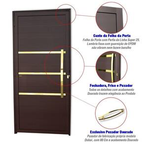 Apresentamos a nossa Porta de Alumínio da Linha Super 25, com uma elegante pintura eletrostática na cor preta. Esta porta é composta por uma única folha que abre para o lado direito, oferecendo um design prático e sofisticado. Os lambris dispostos horizontalmente, juntamente com três frisos polidos, dourados e envernizados, adicionam um toque de luxo à porta. O puxador Dubai de 80 cm, polido e dourado, complementa perfeitamente o design da porta, conferindo-lhe um aspecto harmonioso. Com uma altura de 210 cm e uma largura de 100 cm, e um requadro de 4,6 cm, esta porta é uma opção robusta e imponente para a sua entrada. Para a sua tranquilidade, oferecemos uma garantia de 5 anos contra defeitos de fabricação, garantindo a sua satisfação com o nosso produto. Ambientes Recomendados: Externo Acabamento do Puxador: Polido Acompanha Batedor: Sim Acompanha Batente: Sim Acompanha Fechadura: Sim Acompanha Guarnição: Não Acompanha Manual de Instalação: Sim Acompanha Trinco: Não Altura: 210 cm codigo_ean: 7898721693273 Cor: Preto Dourado Cor do Batente: Preto Cor do Produto: Preto Dourado Escala de Brilho: Fosco Espessura: 4,6 cm Isolamento Acústico: Não Itens Inclusos: 1 Porta completa montada com Fechadura, Dobradiças e embalagem protetora. Acompanha Puxador Lado de abertura: Direita Largura: 100 cm Largura do Batente: 4,6 cm Linha ou Coleção: Super 25 Manual de Montagem e Instalação: https://product-hub-prd.madeiramadeira.com.br/869644/documents/206bd5bc-ba21-4713-af2f-78ceec5403f106manualesquadriasaluminio.pdf Material da Dobradiça: Alumínio Material do Batente: Alumínio Material do Puxador: Aço Material Principal: Alumínio Necessita Montagem: Não Origem do Produto: Nacional Peso: 29 kg Possui Grade: Não Tamanho: 210cm x 100cm Textura da Porta: Frisada Tipo de Dobradiça: Simples Tipo de Parede: Alvenaria Tipo de Porta: Abrir Tipo de Puxador: Externo Vidro incluso: Não
