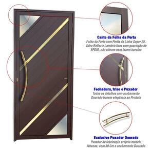 Apresentamos a nossa Porta de Alumínio da Linha Super 25, com pintura eletrostática na cor Corten. Esta porta possui uma folha que abre para o lado direito, proporcionando um design moderno e funcional. O vidro é do tipo Reflex Champanhe com 3mm de espessura, que adiciona um toque de sofisticação. A porta é caracterizada por lambris diagonais com 2 frisos diagonais, polidos, dourados e envernizados, que realçam a sua beleza. A porta é equipada com um puxador Athenas de 80 cm, polido e na cor dourada, que adiciona um toque de elegância. As dimensões da porta são de 210 cm de altura e 100 cm de largura, com um requadro de 4,6 cm. Além disso, oferecemos uma garantia de 5 anos contra defeitos de fabricação, assegurando a qualidade do nosso produto.