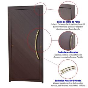 Apresentamos Porta de Alumínio da Linha Super 25, com uma sofisticada pintura eletrostática na cor Corten. Esta porta possui uma única folha que abre para o lado esquerdo, proporcionando um design elegante e funcional. O destaque fica por conta dos lambris dispostos em diagonal, que adicionam um toque de requinte ao conjunto. A porta é complementada por um puxador Athenas de 80 cm, polido e dourado, que harmoniza perfeitamente com os lambris. As dimensões da porta são de 210 cm de altura e 100 cm de largura, com um requadro de 4,6 cm, tornando-a uma opção robusta e imponente para a sua entrada. Além disso, oferecemos uma garantia de 5 anos contra defeitos de fabricação, assegurando a sua tranquilidade e satisfação com o produto. Ambientes Recomendados: Externo Acabamento do Puxador: Polido Acompanha Batedor: Sim Acompanha Batente: Sim Acompanha Fechadura: Sim Acompanha Guarnição: Não Acompanha Manual de Instalação: Sim Acompanha Trinco: Não Altura: 210 cm codigo_ean: 7898721693617 Cor: Marrom Corten Dourado Cor do Batente: Marrom Cor do Produto: Marrom Corten Dourado Escala de Brilho: Fosco Espessura: 4,6 cm Isolamento Acústico: Não Itens Inclusos: 1 Porta completa montada com Fechadura, Dobradiças e embalagem protetora. Acompanha Puxador Lado de abertura: Esquerda Largura: 100 cm Largura do Batente: 4,6 cm Linha ou Coleção: Super 25 Manual de Montagem e Instalação: https://product-hub-prd.madeiramadeira.com.br/869560/documents/479a8cd6-9195-4900-a471-0d1ef836d8e700manualesquadriasaluminio.pdf Material da Dobradiça: Alumínio Material do Batente: Alumínio Material do Puxador: Aço Material Principal: Alumínio Necessita Montagem: Não Origem do Produto: Nacional Peso: 30 kg Possui Grade: Não Tamanho: 210cm x 100cm Textura da Porta: Frisada Tipo de Dobradiça: Simples Tipo de Parede: Alvenaria Tipo de Porta: Abrir Tipo de Puxador: Externo Vidro incluso: Não